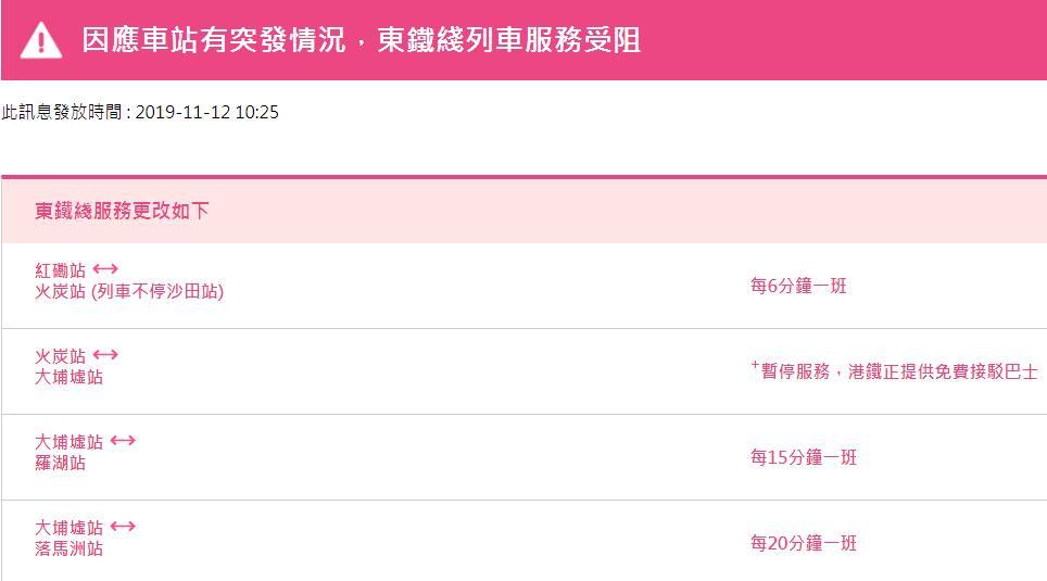據(jù)港鐵官網(wǎng)目前最新消息,東鐵線列車運營服務調整為:紅磡站至火炭站每6分鐘一班;火炭站至大埔墟站暫停服務;大埔墟站至羅湖站每15分鐘一班;大埔墟站至落馬洲站每20分種一班。港鐵其他線路也有多處調整。