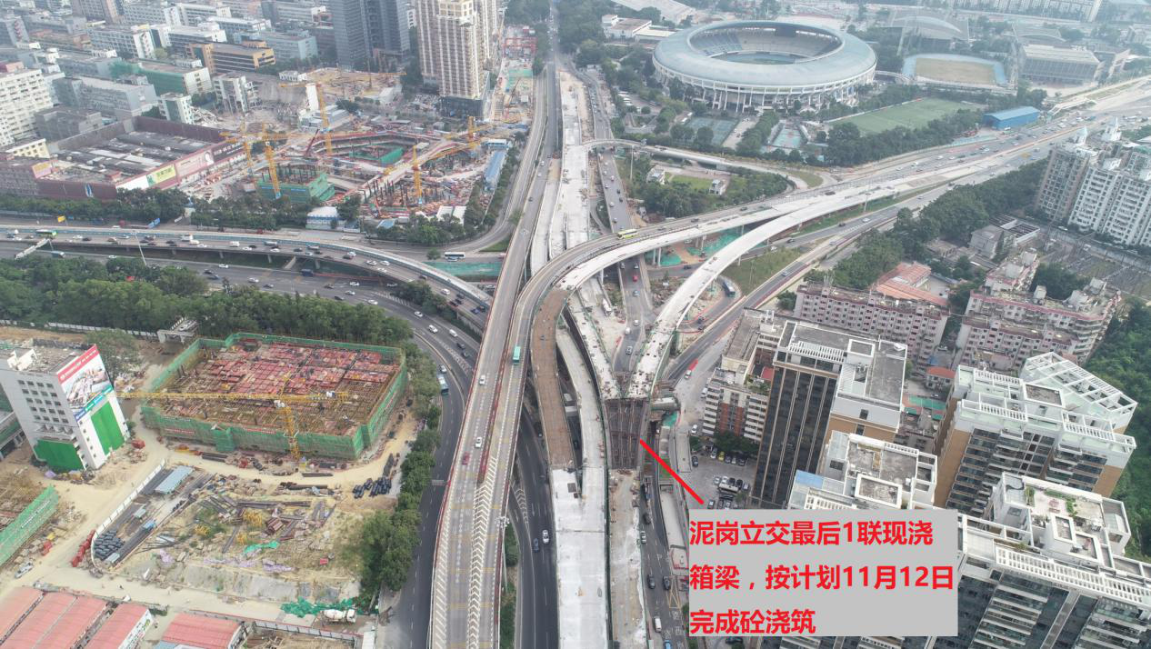 坂銀通道工程北環(huán)立交、泥崗立交橋梁主體工程完成最后1聯(lián)砼箱梁澆筑