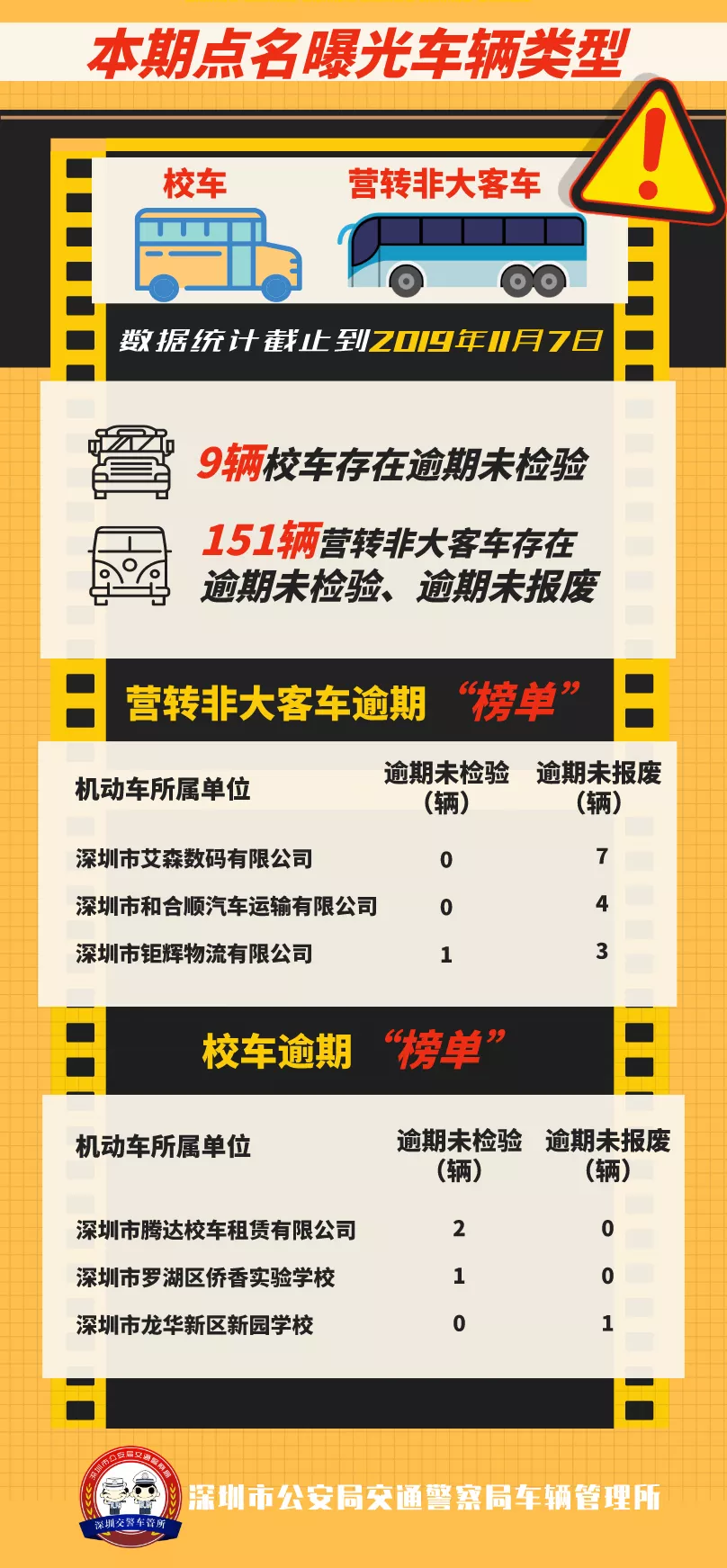 見圳客戶端·深圳新聞網(wǎng)2019年11月14日訊 據(jù)“深圳交警權(quán)威發(fā)布”微信公眾號消息,部分企業(yè)、駕駛?cè)撕鲆暟踩珕栴},對名下“逾期車輛”遲遲不處理,存在著重大安全隱患。深圳交警繼續(xù)針對重點隱患車輛點名曝光,數(shù)據(jù)統(tǒng)計截止到2019年11月7日,9輛校車存在逾期未檢驗,151輛營轉(zhuǎn)非大客車存在逾期未檢驗、逾期未報廢。