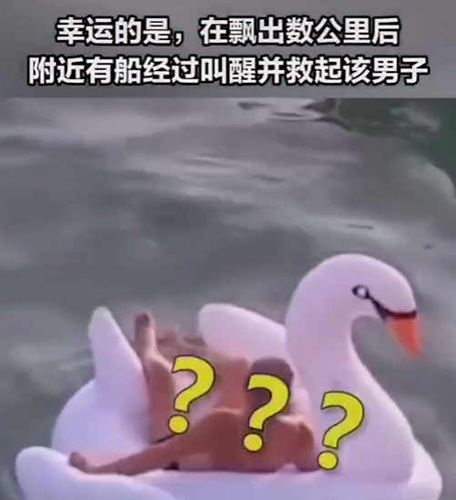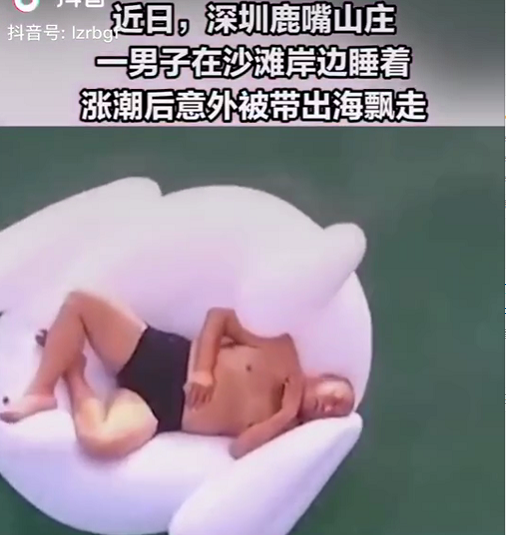 最近,有個(gè)視頻很火。視頻中標(biāo)注:一男子在深圳鹿嘴山莊游玩時(shí),躺在天鵝氣墊上睡著了,漲潮后被帶出海飄走,在飄出數(shù)公里后他被經(jīng)過的船叫醒并救起。