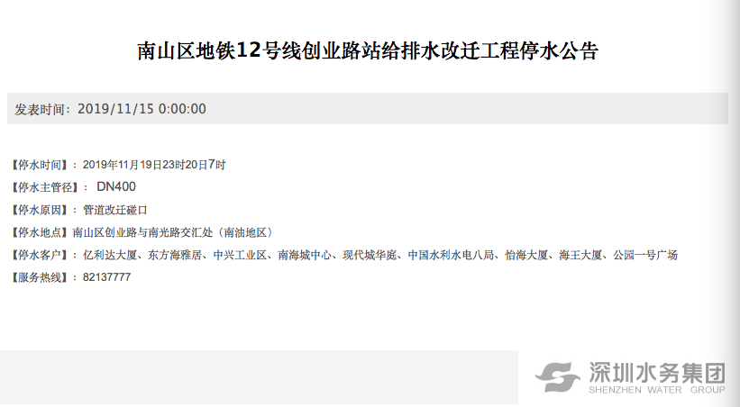 為配合南山區(qū)地鐵12號(hào)線創(chuàng)業(yè)路站給排水改遷工程,深圳水務(wù)集團(tuán)計(jì)劃于11月19日23時(shí)20日7時(shí),對(duì)南山區(qū)創(chuàng)業(yè)路與南光路交匯處DN400供水管道進(jìn)行改遷碰口,屆時(shí)南油地區(qū)暫停供水。具體影響用戶為:億利達(dá)大廈、東方海雅居、中興工業(yè)區(qū)、南海城中心、現(xiàn)代城華庭、中國(guó)水利水電八局、怡海大廈、海王大廈、公園一號(hào)廣場(chǎng)。
