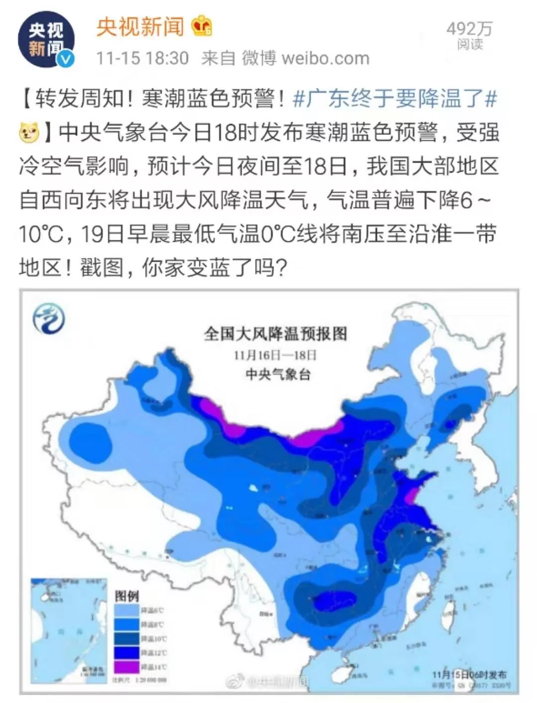 中央氣象臺于15號發(fā)布寒潮藍(lán)色預(yù)警!
