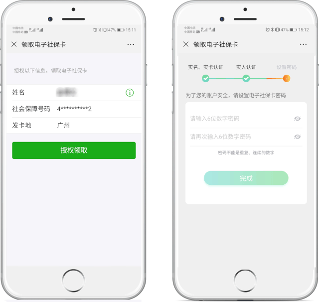 根據(jù)提示授權(quán)領取電子社???,并進行實人實名認證后,設置電子社??艽a,即可完成領取。