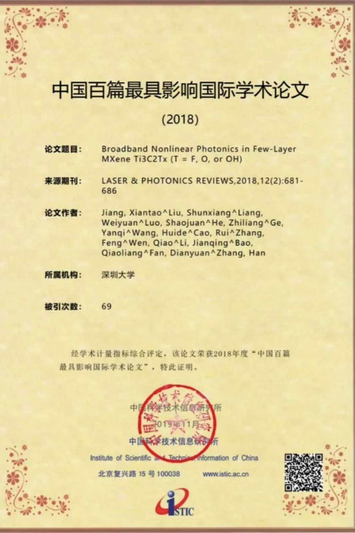 深圳特區(qū)報2019年11月22日訊 11月19日,中國科學技術信息研究所在北京召開中國科技論文統(tǒng)計結果發(fā)布會,公布了2018年中國百篇最具影響國際學術論文。深圳大學張晗教授課題組2篇論文入選,深大入選數(shù)量在中國內地高校和研究機構中并列第10。