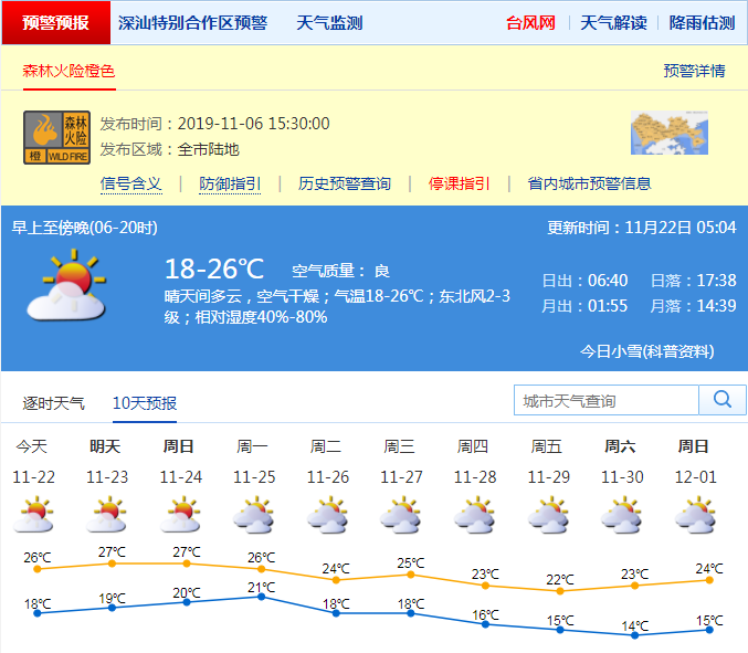 見圳客戶端·深圳新聞網(wǎng)2019年11月22日訊 深圳市氣象局預(yù)計(jì)22日晴天干燥,早晚清涼,氣溫18-26℃;23-24日多云間晴天,部分時(shí)間有輕霧或霾;25日夜間至26日冷空氣影響,北風(fēng)加大,氣溫略降;展望27日夜間冷空氣繼續(xù)補(bǔ)充,氣溫持續(xù)下降。