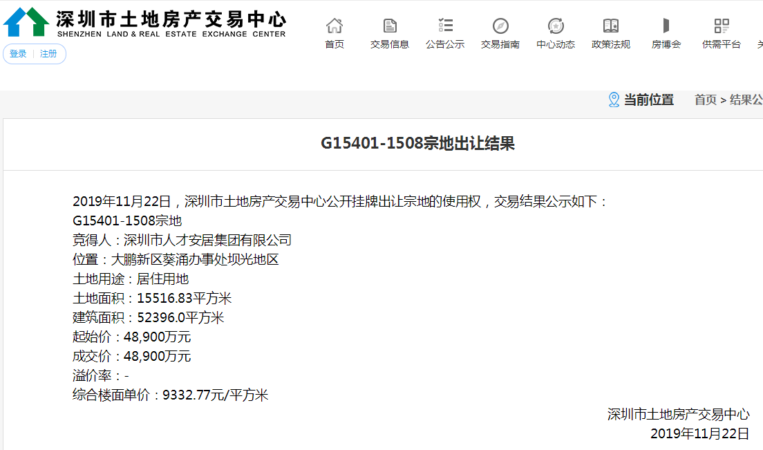見圳客戶端·深圳新聞網(wǎng)2019年11月27日訊 記者從深圳政府在線網(wǎng)站了解到,11月22日下午,深圳市首宗出售型人才住房用地--G15401-1508宗地即大鵬新區(qū)壩光03-08地塊,被深圳市人才安居集團以總價4.89億元成功競得。