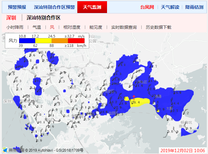 從實時的風(fēng)力圖上可以看到,龍崗區(qū)、坪山區(qū)、鹽田區(qū)、大鵬新區(qū)大部風(fēng)力在10.8m/s至17.2m/s,更有部分區(qū)域風(fēng)力達黃色預(yù)警。