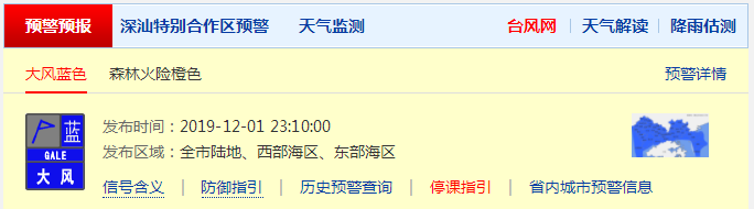深圳市氣象臺于12月1日23時10分在全市發(fā)布大風(fēng)藍色預(yù)警,預(yù)計平均風(fēng)力將達6級以上(或陣風(fēng)8級以上),目前大風(fēng)藍色預(yù)警持續(xù),今天東北風(fēng)4-5級,沿海、高地和海區(qū)陣風(fēng)7-8級。