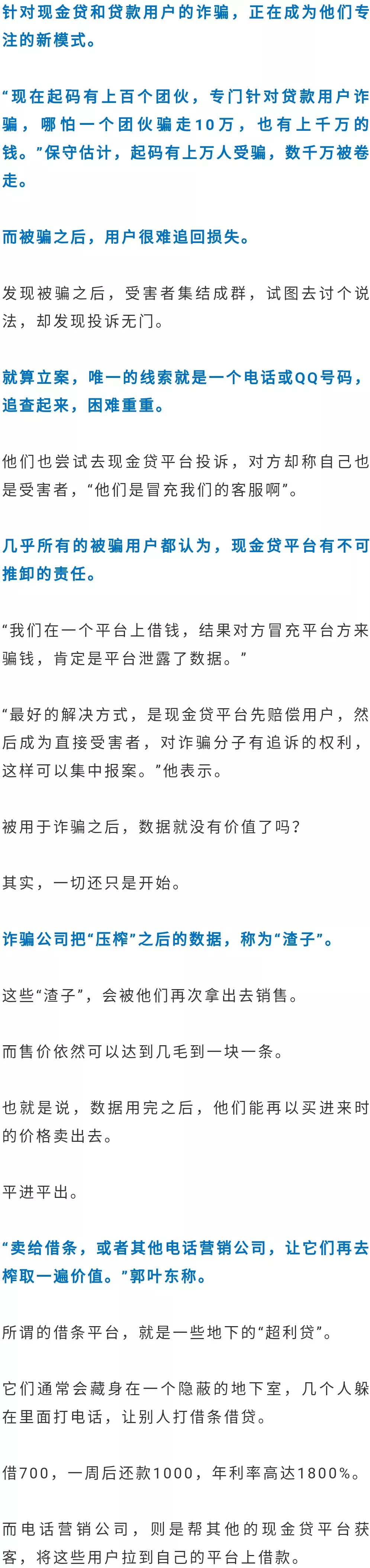 “其實,我們的數(shù)據(jù),大多是現(xiàn)金貸平臺自己賣給我們的。”一位從事過電話詐騙的從業(yè)者稱。