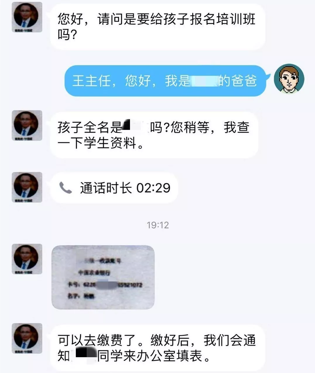 小陳也讓爸爸放心,這個(gè)錢不是打給他的,而是由家長(zhǎng)直接繳費(fèi)給“王老師”。隨后給了“王老師”的工作QQ。