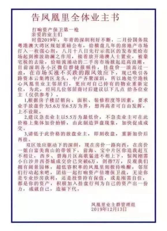 近日,福海街道中糧鳳凰里花苑小區(qū)個別業(yè)主發(fā)布集體漲價言論,涉嫌惡意炒作二手房價,以下為網傳業(yè)主倡議書