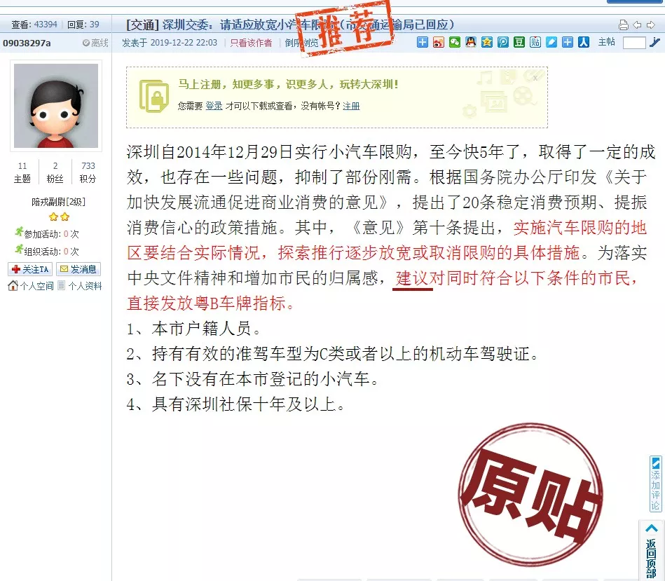 經(jīng)核查,該截圖為網(wǎng)民12月22日在深圳論壇發(fā)布的網(wǎng)帖截選內(nèi)容,完整內(nèi)容是該網(wǎng)民對(duì)我市小汽車指標(biāo)增量調(diào)控政策提出的建議。