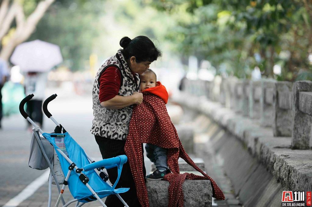 2019年11月19日,深圳福田區(qū),由于氣溫驟降,一位家長正在為孩子添衣保暖。