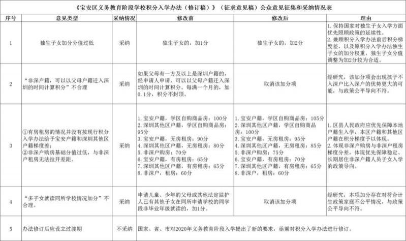 晶報(bào)2020年01月06日訊 獨(dú)生子女加分?jǐn)M由1分調(diào)整至2分,多子女就讀同所學(xué)校加分取消。日前,《寶安區(qū)義務(wù)教育階段學(xué)校積分入學(xué)辦法(修訂稿)》(征求意見稿)經(jīng)論證修改后再度公示。去年12月,寶安區(qū)教育局發(fā)布相關(guān)公告,擬對(duì)積分入學(xué)錄取方式和積分方式進(jìn)行修訂,其中,"獨(dú)生子女加分從90分調(diào)整至1分"引發(fā)廣泛關(guān)注。在新修訂稿中,寶安區(qū)教育局結(jié)合市民意見反饋,擬將獨(dú)生子女加分由1分調(diào)整至2分,并取消兩項(xiàng)加分項(xiàng),同時(shí)對(duì)部分情況分值進(jìn)行調(diào)整,以體現(xiàn)積分梯度。