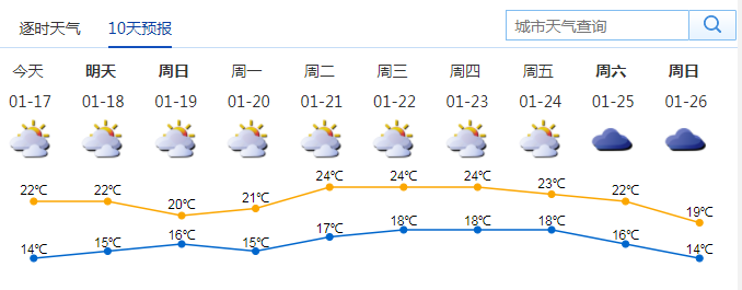 最低氣溫降至12-13℃,伴有小雨和霧;其余時段多云為主,可見陽光。