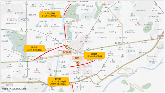 預(yù)計(jì)國(guó)貿(mào)-東門(mén)老街片區(qū)春節(jié)假期周邊主要擁堵路段有解放路(16:30-17:30西行)、人民公園路(14:30-16:00北行)、嘉賓路(16:30-18:00東行)、和平路(14:30-15:30南行、20:00-21:30南行)。具體分布如下: