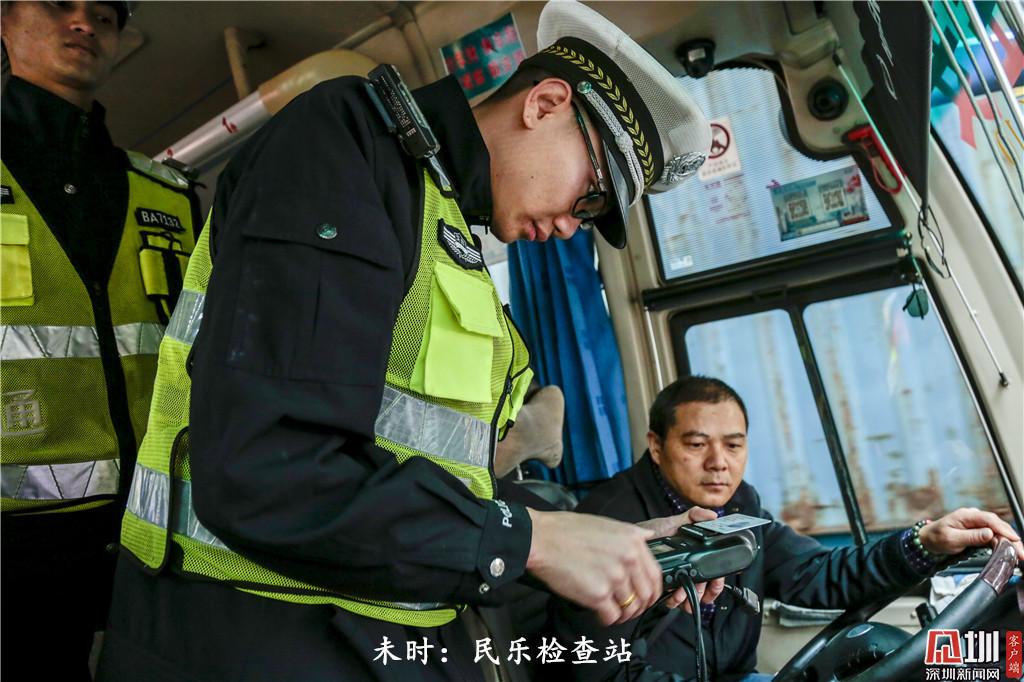 下午14時50分左右,一名深圳交警民警對一輛營運(yùn)客車司機(jī)進(jìn)行檢查。