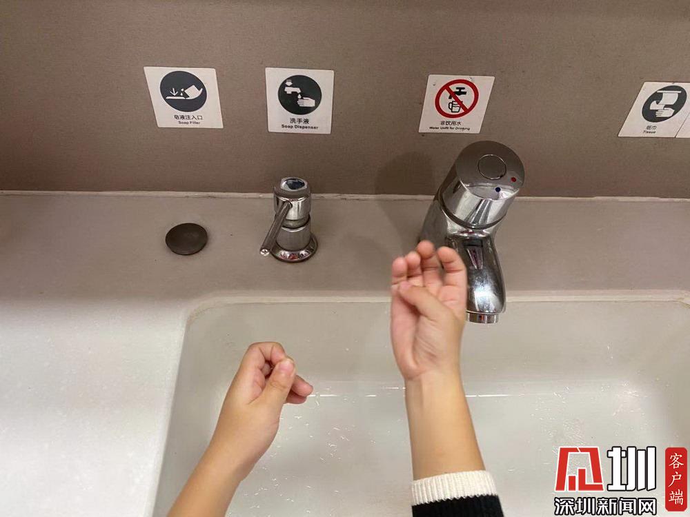 我好像聽見我的肚子開始叫了,媽媽讓我先洗手才能吃東西。洗手池這里有洗手液和一次性擦手紙,水都是溫的,洗手的時候很舒服。見圳客戶端、深圳新聞網(wǎng)記者 劉婷 攝