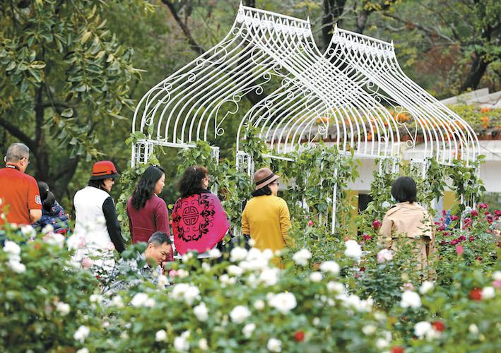 ▲玫瑰之約月季主題花園吸引市民駐足觀賞。
