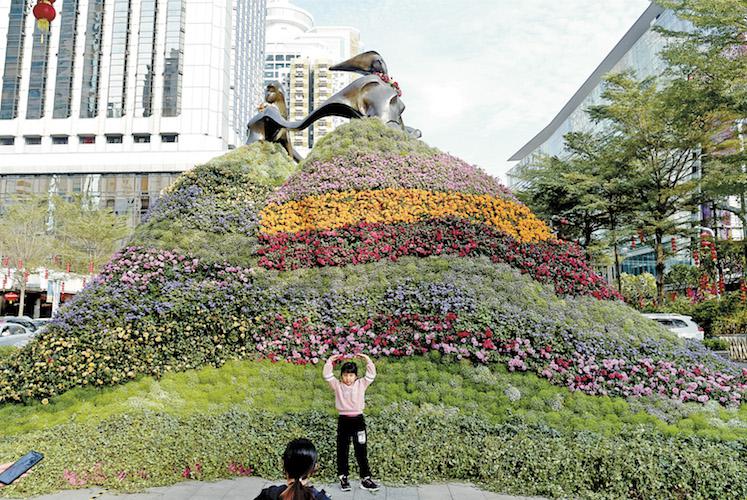 ▲國(guó)貿(mào)廣場(chǎng)前"愛神永駐"花塑。