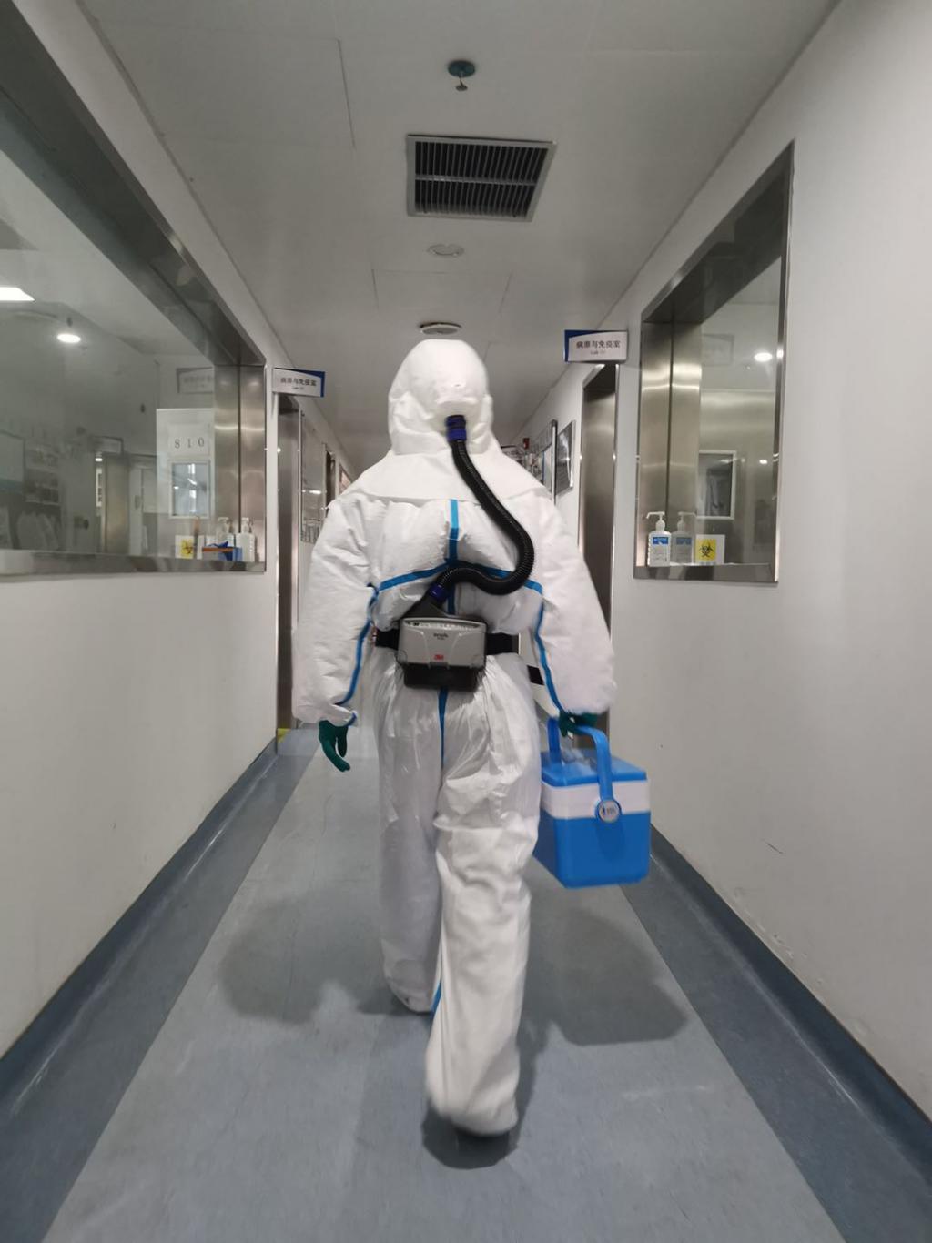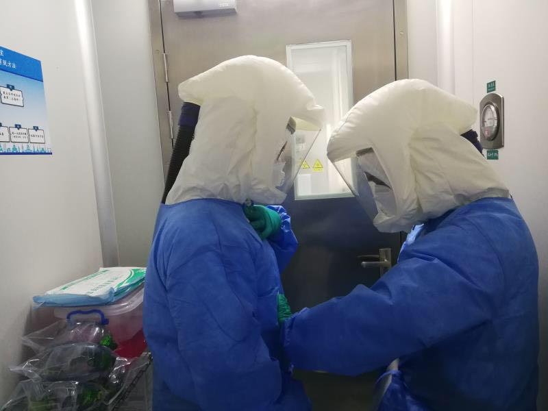 ▲大年三十,深圳市第三人民醫(yī)院實驗室正在進行確診患者的病毒載量動態(tài)檢測,他們在操作的時候穿著重達3至4斤的個人防護裝備,進去一次就連續(xù)工作4個小時左右,每次出來內(nèi)衣全部濕透。