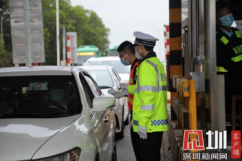 26日下午深圳黃鶴收費(fèi)站,深圳交警對(duì)往來(lái)司機(jī)進(jìn)行體溫檢測(cè)。