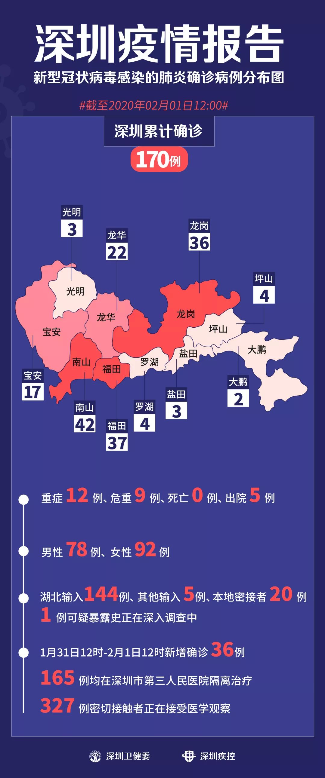 深圳病人糞便中檢出病毒陽性 2月1日晚,深圳市第三人民醫(yī)院透露,該院肝病研究所發(fā)現(xiàn),在某些新型冠狀病毒感染的肺炎確診患者的糞便中檢測出2019-nCoV核酸(新型冠狀病毒)陽性,很有可能提示糞便中有活病毒存在。目前研究人員正在做進(jìn)一步分離病毒的研究。 此外,國際醫(yī)學(xué)期刊《新英格蘭醫(yī)學(xué)雜志》最新刊登的一篇文章也透露,醫(yī)生們在美國首位“新型肺炎”病人的腹瀉糞便樣本中檢測出了新型冠狀病毒的存在(rRT-PCR結(jié)果陽性)。 在此提醒市民,一定要更加注意勤洗手,尤其是便后、飯前,一定要用流水+肥皂或洗手液,洗手20秒以上。 1月31日12時至2月1日12時,深圳新增36個確診病例 病例135 47歲女性患者,常住北京。1月15日前往武漢探親,22日乘私家車前往深圳。1月23日發(fā)病,1月27日入院,目前情況穩(wěn)定。 病例136 病例98的女兒 4歲女性患者,常住湖北省十堰市。在密切接觸者采樣檢測中,發(fā)現(xiàn)新型冠狀病毒陽性,故于1月27日入院,目前情況穩(wěn)定。 病例97:64歲男性患者,常住于湖北省十堰市。2020年1月22日抵達(dá)深圳,24日發(fā)病,26日入院就診。 病例98(病例97的兒子):40歲男性患者,常住于深圳市龍崗區(qū)。2020年1月22日,父親從湖北抵達(dá)深圳,24日發(fā)病,26日入院就診。 病例137 56歲男性患者,常住湖北省武漢市。1月21號前往深圳。1月26日發(fā)病,1月28日入院,目前情況穩(wěn)定。 病例138 59歲男性患者,常住深圳市龍華區(qū)。1月16日自駕從深圳前往武漢,1月23日開車回到深圳。1月26日發(fā)病,當(dāng)日入院,目前情況穩(wěn)定。 病例139 病例138妻子 57歲女性患者,常住深圳市龍華區(qū)。1月16日自駕深圳前往武漢,1月23日開車回到深圳。1月24日發(fā)病,1月26日入院,目前情況穩(wěn)定。 病例140 66歲女性患者,常住湖北省武漢市。1月22日前往深圳。1月23日發(fā)病,1月28日入院,目前情況穩(wěn)定。 病例141 78歲男性患者,常住湖北省武漢市。1月16日前往深圳探親。1月26日發(fā)病,1月27日入院,目前情況穩(wěn)定。 病例142 61歲女性患者,常住湖北省武漢市。1月21日前往深圳探親。1月22日發(fā)病,1月28日入院,目前情況穩(wěn)定。 病例143 54歲男性患者,常住深圳市南山區(qū)。1月21日前往武漢,23日返回深圳。1月25日發(fā)病,1月28日入院,目前情況穩(wěn)定。 病例144 55歲女性患者,常住深圳市南山區(qū)。1月21日由深圳前往武漢,23日返回深圳。1月24日發(fā)病,1月29日入院,目前情況穩(wěn)定。 病例145 57歲女性患者,常住深圳市南山區(qū)。1月13日從深圳到武漢探親,1月23日從武漢自駕返回深圳。1月26日發(fā)病,1月27日入院,目前情況穩(wěn)定。 病例146 病例29父親 76歲男性患者,常住湖北省武漢市。1月15日從武漢出發(fā)前往廣西南寧旅游,1月18日從廣西南寧出發(fā)前往深圳探親。1月27日發(fā)病,1月28日入院,目前情況穩(wěn)定。 病例29:49歲女性患者,長期居住湖北武漢,2020年1月15日從武漢到廣西南寧,18日從南寧到佛山,20日從佛山抵達(dá)深圳,21日發(fā)病,22日入院就診。 病例147 病例105的女兒 6歲女性患者,常住深圳市羅湖區(qū)。1月12日前往武漢,1月22日乘私家車前往河南信陽,23日乘私家車前往深圳。在密切接觸者采樣檢測中發(fā)現(xiàn),新型冠狀病毒陽性,故于1月28日入院,目前情況穩(wěn)定。 病例105:35歲男性患者,常住于深圳市羅湖區(qū)。2020年1月17日自駕車由深圳開往武漢,22日自駕車從武漢開往河南信陽探親,23日自駕車從河南信陽開往深圳,當(dāng)日發(fā)病,25日入院就診。 病例106(病例105妻子):36歲女性患者,常住于深圳市羅湖區(qū)。2020年1月17日乘私家車由深圳到武漢,22日乘私家車從武漢到河南信陽探親,23日乘私家車從河南信陽到深圳,24日發(fā)病,25日入院就診。 病例107(病例105丈母娘):61歲女性患者,常住于深圳市羅湖區(qū)。1月12日從深圳前往武漢,22日乘私家車從武漢到河南信陽探親,23日乘私家車從河南信陽到深圳,24日發(fā)病,25日入院就診。 病例148 38歲女性患者,常住深圳市福田區(qū)。1月23日接觸從武漢來深的父母(都未確診)。1月27日發(fā)病,當(dāng)日入院,目前情況穩(wěn)定。 病例149 33歲女性患者,常住深圳市福田區(qū)。1月19日前往武漢,乘私家車到潛江探親,1月24日乘私家車返回深圳。1月28日發(fā)病,當(dāng)日入院,目前情況穩(wěn)定。 病例150 49歲男性患者,常住深圳市龍華區(qū)。1月18日前往武漢探親,1月23日回到深圳。1月25日發(fā)病,1月27日入院,目前情況穩(wěn)定。 病例151 病例150的女兒 18歲女性患者,常住深圳市龍華區(qū)。1月18日前往武漢探親,1月23日回到深圳。1月25日發(fā)病,1月29日入院,目前情況穩(wěn)定。 病例152 56歲女性患者,常住江蘇省南京市。1月21日乘私家車到武漢,1月22日前往深圳。1月26日發(fā)病,當(dāng)日入院,目前情況穩(wěn)定。 病例153 病例84的丈夫 58歲男性患者,常住深圳市龍華區(qū)。在密切接觸者采樣檢測中發(fā)現(xiàn),新型冠狀病毒陽性,故于1月29日入院,目前情況穩(wěn)定。 病例84:52歲女性患者,常住深圳市龍華區(qū)。2020年1月19日至22日在武漢,22日-23日從武漢到仙桃市探親,23日發(fā)病,24日駕車至長沙,25日從長沙抵達(dá)深圳后入院就診。 病例154 病例114的妻子 34歲女性患者,常住深圳市龍華區(qū)。1月22日前往湖南省冷水江市,1月27日返回深
