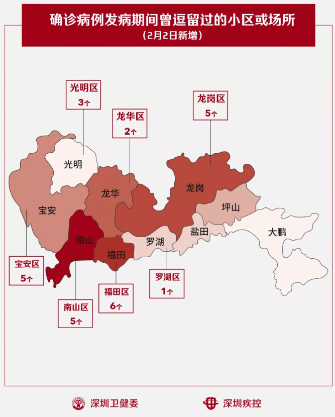2月2日,疾控專業(yè)人員通過(guò)最新的流行病學(xué)調(diào)查確認(rèn),深圳新增27個(gè)小區(qū)(場(chǎng)所),有新確診的病人在出現(xiàn)病征期間曾經(jīng)逗留。
