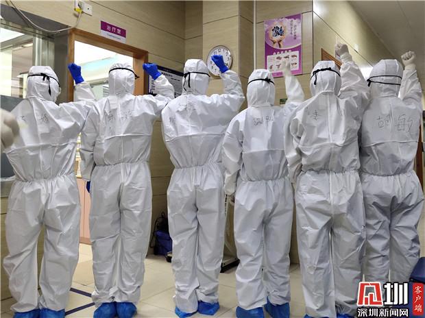 發(fā)熱門診工作人員相互鼓勵(lì)。