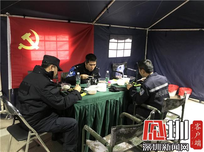 大鵬公安分局機(jī)訓(xùn)大隊(duì)的隊(duì)員們在帳篷內(nèi)用午餐