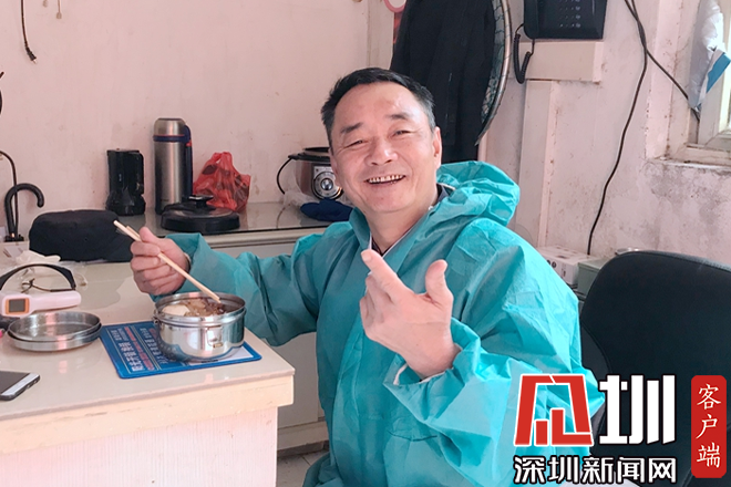 “吃飯沒(méi)有?還沒(méi)吃啊”“稍等下,要先測(cè)下體溫”……2月6日,龍崗區(qū)禾田路錦繡東方A區(qū)的保安廖師傅在崗位上忙著給出入的居民檢測(cè)體溫。廖師傅今年54歲,老家在廣東惠州,平常就住在附近小區(qū),在保安這個(gè)崗位上已經(jīng)工作了3年。