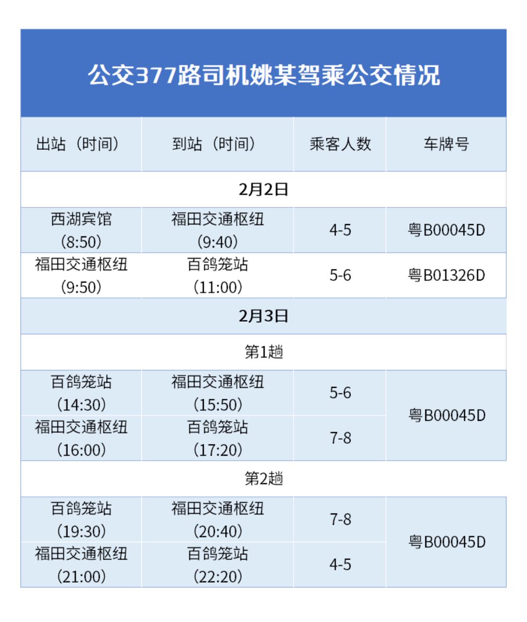 2月3日,姚某分別于14時30分、19時30分駕車往返百鴿籠站至福田交通樞紐各一趟,每趟乘客人數(shù)為4-8人。