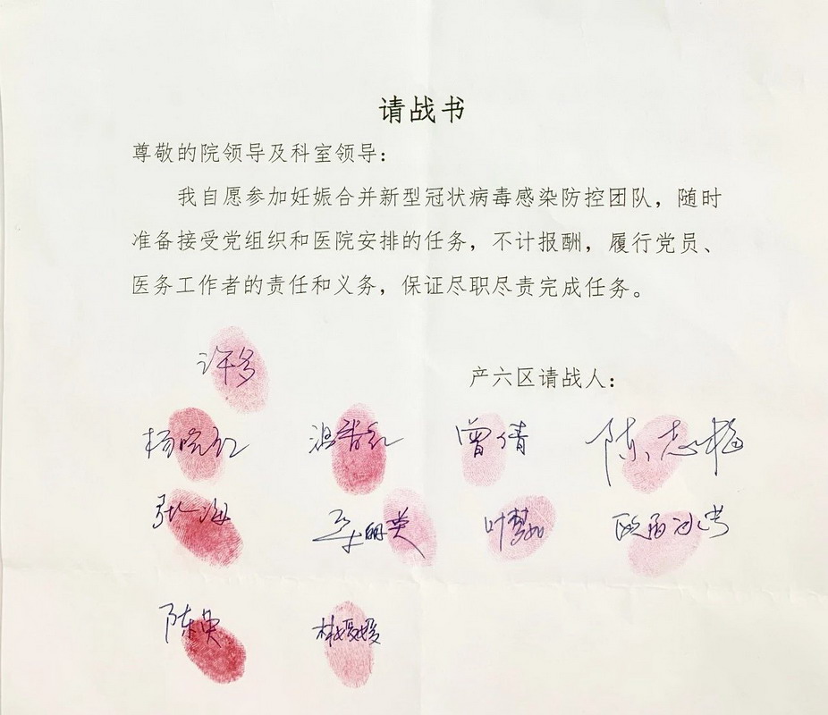 面對疫情,黨員干部紛紛向科室提交請戰(zhàn)書并莊嚴宣誓,志愿參加疫情防控的阻擊戰(zhàn)。產(chǎn)科共收到200多份請戰(zhàn)書,特別是有三名孕婦請纓,令人動容。請戰(zhàn)人員組成了三個防控梯隊,為醫(yī)院妊娠合并新型冠狀病毒感染防控奠定了強大的人力資源保障。