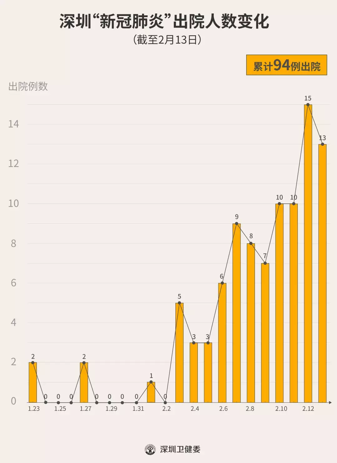 2月13日下午,經專家組會診,深圳再有13名新型冠狀病毒肺炎確診患者出院,累計達94人。