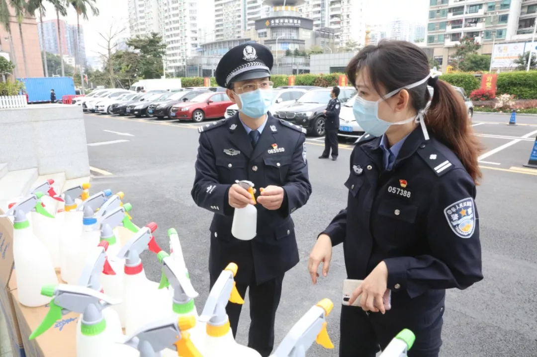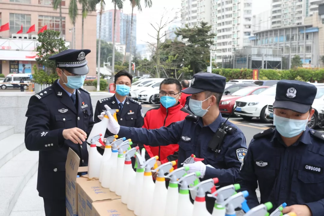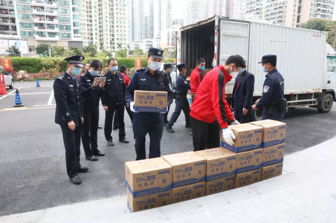 當(dāng)天16時許,愛心企業(yè)代表肖先生帶著50桶20公斤消毒液、480瓶消毒酒精、20個噴壺來到了福田分局,捐贈給了福田警方。福田分局黨委委員、政治處主任桂禮強(qiáng)代表分局接收捐贈抗疫物資,并對愛心企業(yè)表示感謝。