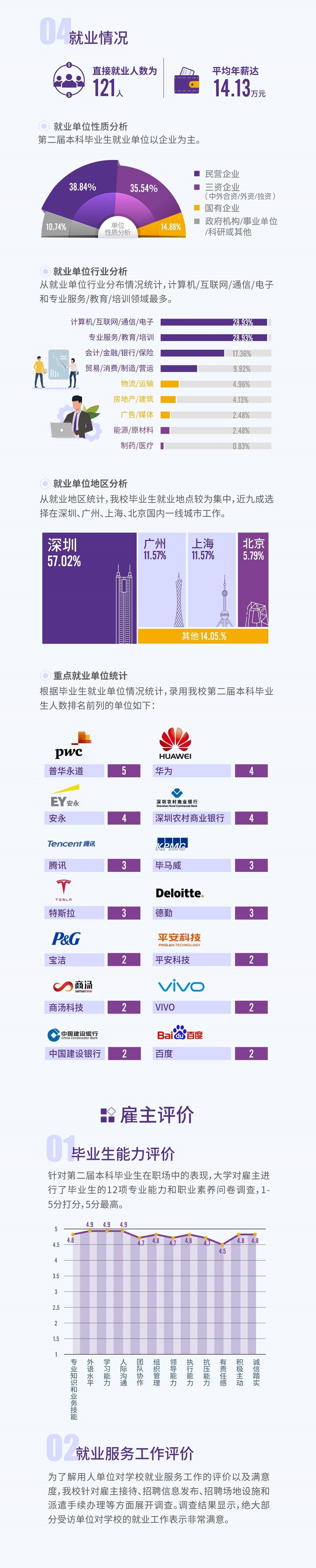 2019年,本科畢業(yè)生就業(yè)單位性質更多元。除跨國公司、民營企業(yè)外,更多學生被國有企業(yè)、事業(yè)單位青睞。數(shù)據(jù)顯示,第二屆本科畢業(yè)生的就業(yè)單位中,民營企業(yè)占38.84%,如華為、百度;三資企業(yè)(中外合資/外資/獨資)占35.54%,如騰訊、寶潔、可口可樂、四大會計師事務所;國有企業(yè)占14.88%;另有10.74%畢業(yè)生受聘于政府機構/事業(yè)單位/科研等機構。