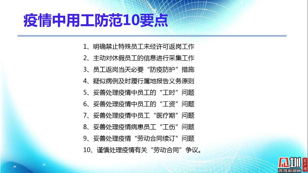 見圳客戶端?深圳新聞網(wǎng)2020年2月18日訊(見圳客戶端、深圳新聞網(wǎng)記者 焦慧茹)疫情影響了社會的方方面面,給企業(yè)和職工帶來了新的問題。對于廣大職工而言,擔(dān)心的是疫情期間工資發(fā)放、復(fù)工安排等。對于企業(yè)而言,擔(dān)心的是如何順利復(fù)工復(fù)產(chǎn)。為此,深圳市總工會聯(lián)合深圳新聞網(wǎng)推出“復(fù)工防疫微課堂”第六期,邀請講師楊文浩,分析、整理了疫情之下企業(yè)復(fù)工用工防范要點,幫助大家解決困惑。