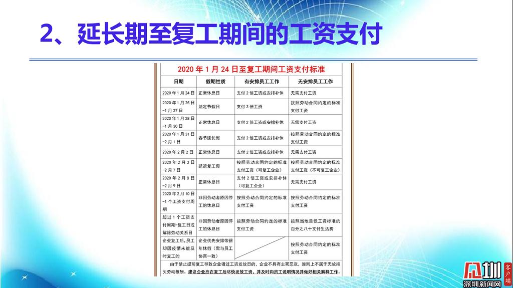延長期至復(fù)工期間的工資支付問題。延期提前開工,足額支付、加班雙倍;延期正常開工,遵循法規(guī)、正常出勤;開工停工停業(yè),首月按照勞動合同規(guī)定正常支付,次月遵法即可;在家網(wǎng)上開工,工資照常應(yīng)照常發(fā)放;開工不足機制,輪崗待崗、假期協(xié)商;遵守當(dāng)?shù)胤ㄒ?guī),因地制宜,和諧有道。