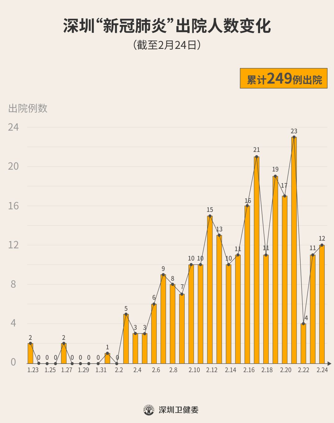 2月24日下午,經(jīng)專家組會(huì)診,深圳有12名新型冠狀病毒肺炎確診患者出院,累計(jì)達(dá)249人,連續(xù)22天有人出院。