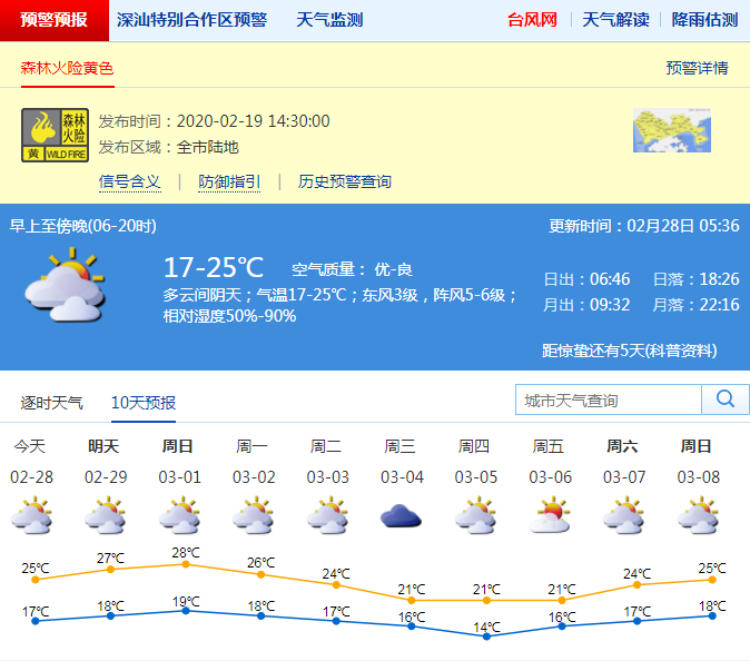 見圳客戶端·深圳新聞網(wǎng)2020年2月28日訊 深圳市氣象臺(tái)預(yù)計(jì),27日晚到28日,深圳陰天間多云,氣溫18-25 ℃,相對濕度50%-95%,東風(fēng)3-4級(jí),沿海、高地和海區(qū)陣風(fēng)可達(dá)7級(jí);29日至3月3日多云為主,天氣總體溫暖,氣溫小幅波動(dòng),早晚有輕霧,偶有零星小雨;4日 -5日受冷空氣影響,氣溫明顯下降,其中4日有零星小雨。