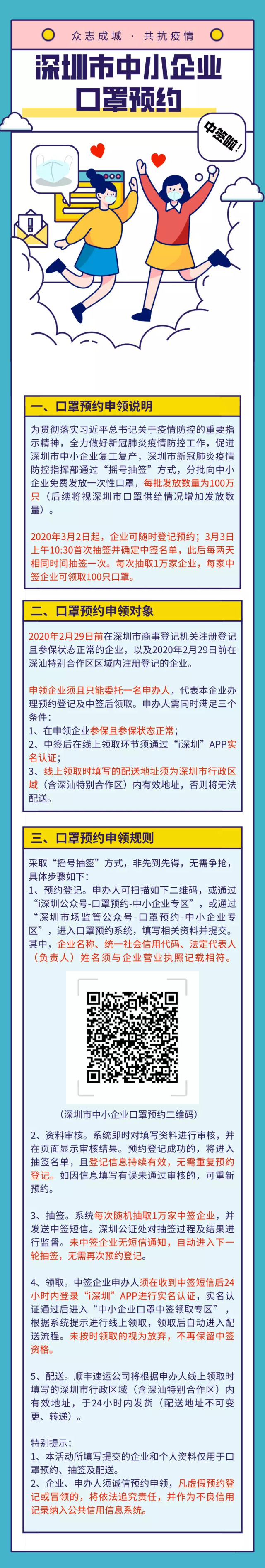 南方網(wǎng)2020年3月6日訊 好消息!深圳市中小企業(yè)可以預(yù)約申領(lǐng)口罩啦!2020年2月29日前在深圳市深汕特別合作區(qū)區(qū)域內(nèi)注冊(cè)登記的企業(yè),均可以預(yù)約申領(lǐng)!配送地址必須是深圳市行政區(qū)域(含深汕特別合作區(qū)),免費(fèi)包郵哦!
