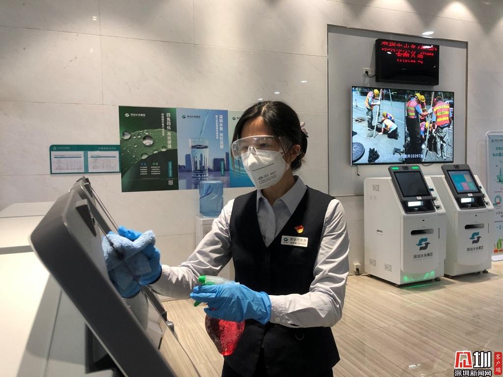 福田分公司福田營業(yè)廳楊麗娜,正對自動服務(wù)機(jī)進(jìn)行消毒。