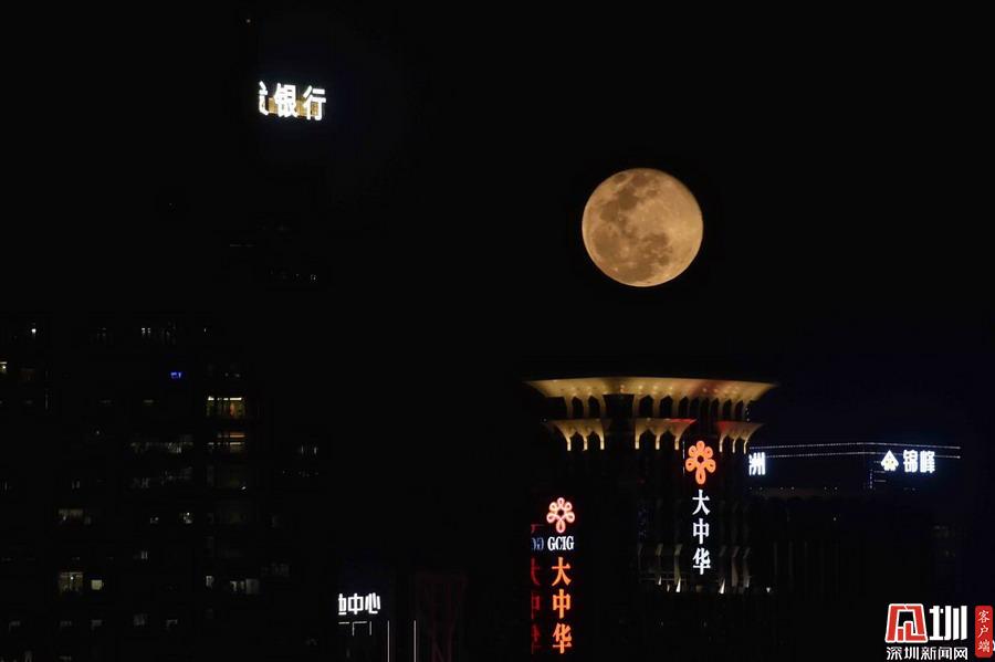 “超級(jí)月亮”出現(xiàn)在福田區(qū)上空。(圖為二次曝光)