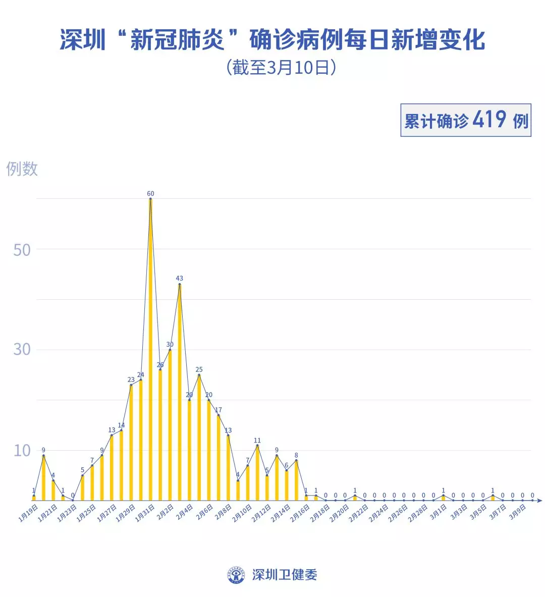 截至3月10日24時,深圳累計報告“新冠肺炎”確診病例419例。3月10日當天全市無新增確診病例,當天出院病例6例(從2月26日起不再公布出院個案)。