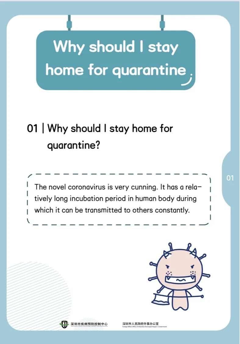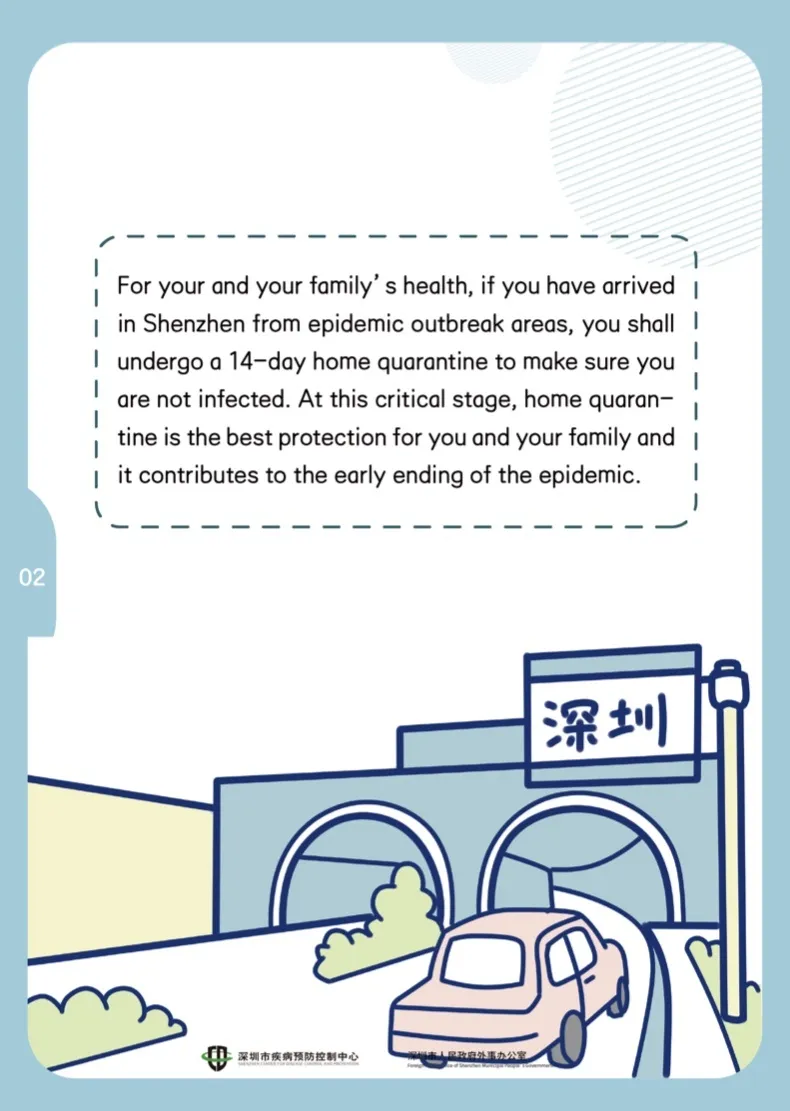 因此,為了您和家人健康,從疫情高發(fā)重點地區(qū)來深返深后,應(yīng)當(dāng)進(jìn)行14天居家隔離,以確認(rèn)沒有感染病毒。在這非常時期,做好居家隔離既是對您自己和家人最好的保護,也是為疫情早日結(jié)束做貢獻(xiàn)。