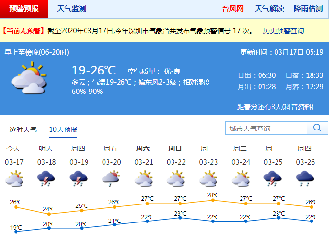 見圳客戶端·深圳新聞網(wǎng)2020年3月17日訊 深圳17日回暖增濕,18-19日有雷陣雨。17日可見陽(yáng)光,早晚有輕霧,19-26℃;18-19日多云到陰天,有雷陣雨局部大雨;20-23日溫暖濕潤(rùn),早晚有輕霧或霧。