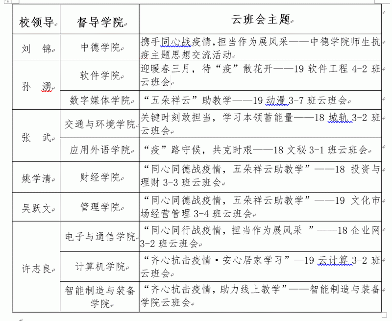 深圳信息學(xué)院校領(lǐng)導(dǎo)參加“云班會(huì)”安排表。