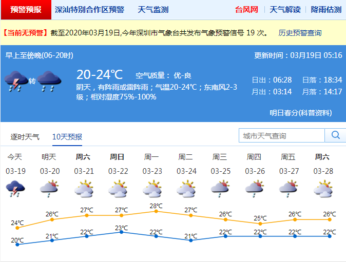 當(dāng)前,深圳已進(jìn)入強(qiáng)對流天氣多發(fā)季節(jié)。未來幾日天氣是否平穩(wěn)?據(jù)市氣象臺(tái)預(yù)測,19日深圳有雷陣雨,局部大雨,氣溫20℃至24℃;20日陣雨轉(zhuǎn)多云;21日至24日濕度加大,氣溫逐日回升,天氣轉(zhuǎn)熱,早晚有輕霧或霧。