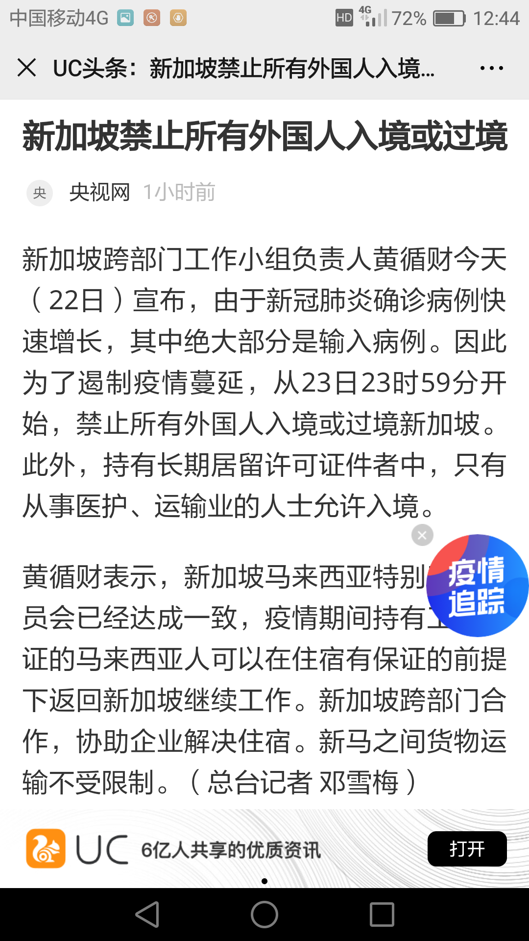 今日早些時候,據(jù)央視網(wǎng)報道,新加坡跨部門工作小組負責(zé)人宣布,為遏制疫情蔓延,從23日23時59分開始,禁止所有外國人入境或過境新加坡。同時,持有長期居留許可證件者中,也只有從事醫(yī)護、運輸業(yè)的人士允許入境。(記者蔡良煥)