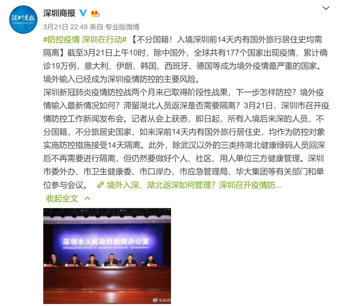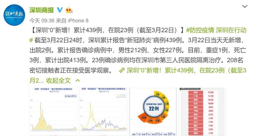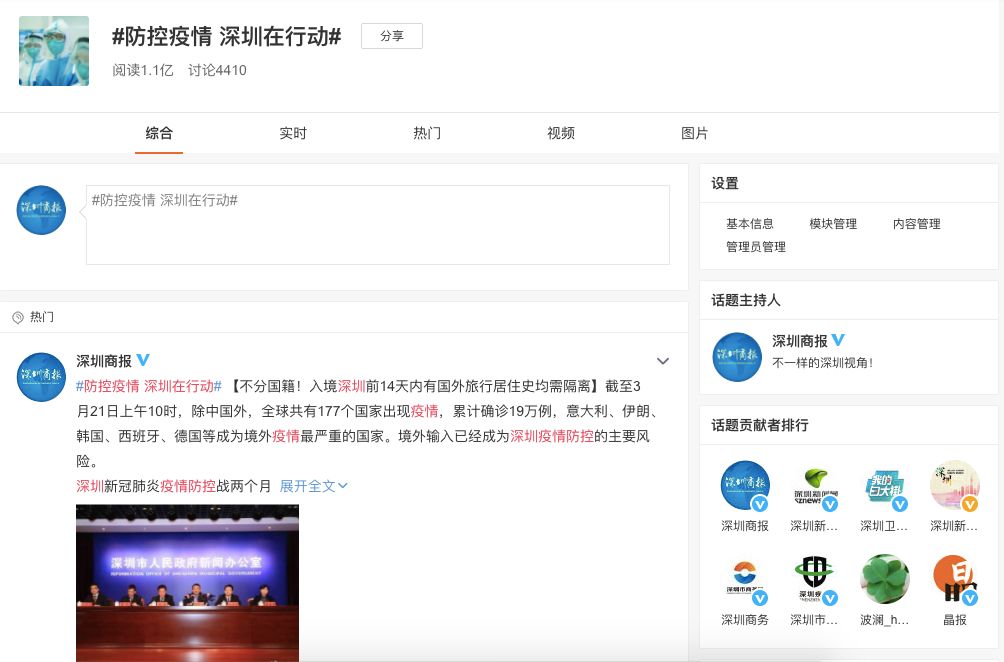 疫情發(fā)生初期,深圳商報(bào)微博創(chuàng)建話題 #防控疫情 深圳在行動# ,以高度的責(zé)任感和使命感全方位加強(qiáng)宣傳報(bào)道和輿論引導(dǎo),疫情相關(guān)信息均帶話題發(fā)布,人們可以系統(tǒng)地查看疫情相關(guān)信息。